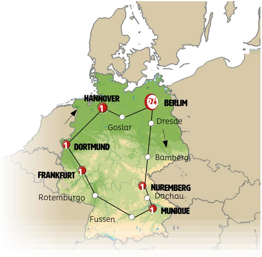 Berlim, Dresden, Bamberg, Nuremberg, kloster weltenburg, Dachau, Munique, Füssen, Rotemburgo, Frankfurt, crucero por el rhin, Colônia, Dortmund, ruta cuentos de hadas, Hannover, Goslar.