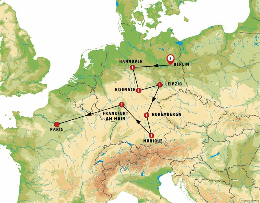 Berlim, wolfsburgo, Celle, Hannover, Goslar, gotinga, bad sooden, Eisenach, Gotha, Erfurt, Leipzig, Dresden, Bamberg, Nuremberg, kloster weltenburg, Dachau, Munique, Füssen, Rotemburgo, Frankfurt, Luxemburgo, Reims, Paris.
