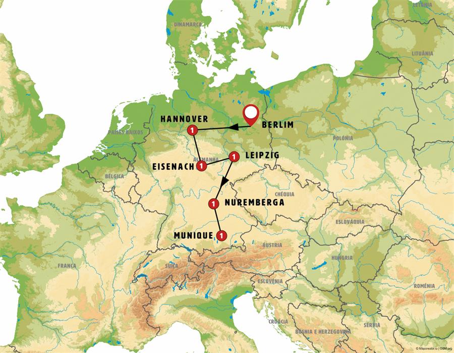 Berlim, wolfsburgo, Celle, Hannover, Goslar, gotinga, bad sooden, Eisenach, Gotha, Erfurt, Leipzig, Dresden, Bamberg, Nuremberg, kloster weltenburg, Dachau, Munique.