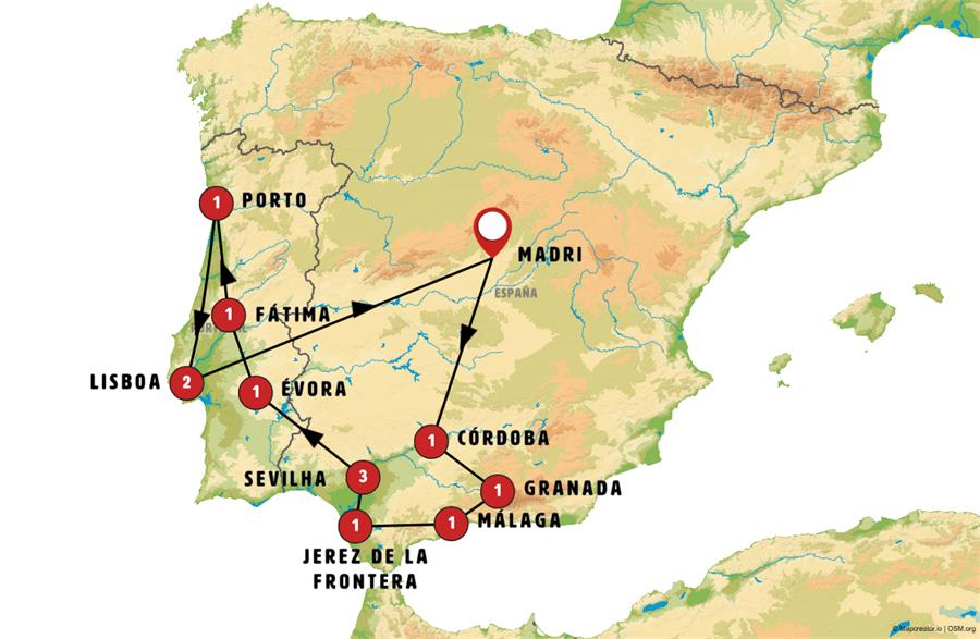 Madrid, Córdoba, baena, Granada, Nerja, Frigiliana, Málaga, Puerto Banus, setenil de las bodegas, Ronda, Jerez de La Frontera, el puerto de santa maria, Cádis, Sevilha, palos de la frontera, Huelva, El Rocio, Merida, Évora, Marvão, Castelo de Vide, Tomar, Fátima, Porto, Coimbra, Batalha, Nazaré, Óbidos, Lisboa, Cáceres.