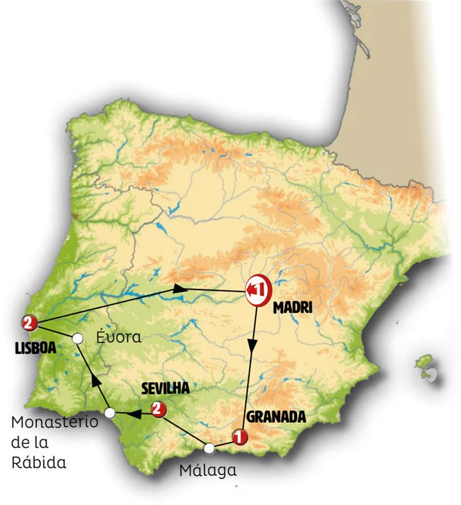 Madrid, Granada, Nerja, Málaga, Ronda, Sevilha, Merida, Évora, Lisboa, Cáceres.