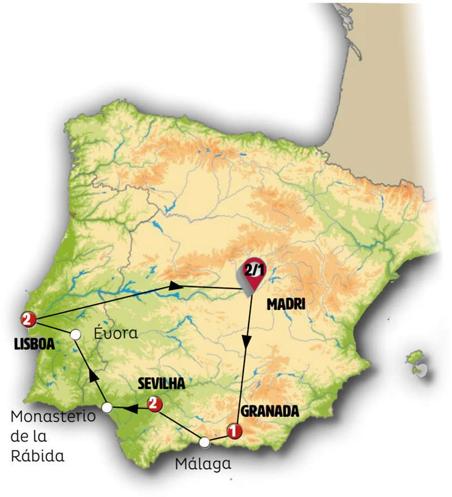 Madrid, Granada, Nerja, Málaga, Ronda, Sevilha, Merida, Évora, Lisboa, Cáceres.