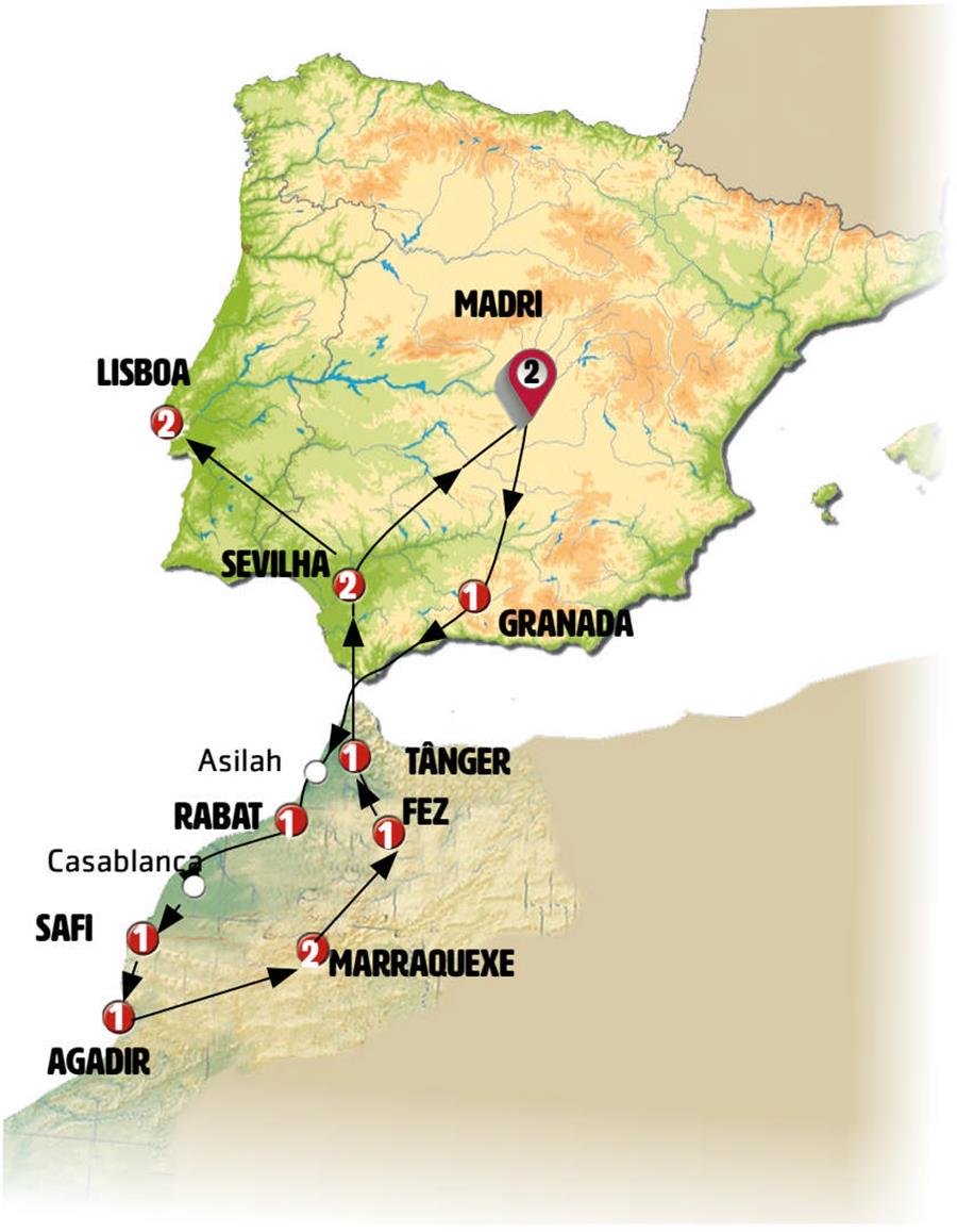 Madrid, Granada, Tânger, assilah, Rabat, Casablanca, El Jadida, Safi, esauira, Agadir, Marrakech, ouzoud, Fes, Sevilha, Merida, Évora, Lisboa.
