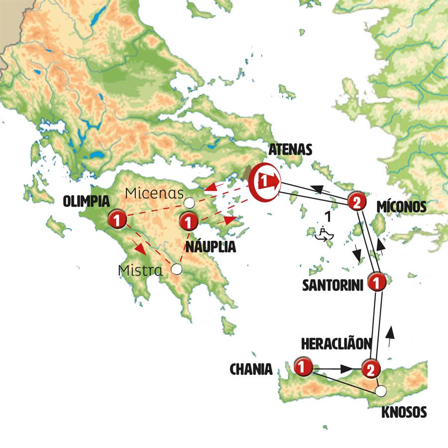 Hoje faremos uma excursão (ingresso e visita guiada) ao PALÁCIO DE CNOSSOS, que nos permite conhecer a cultura minoica que deu origem à grega há quatro mil anos. Tarde livre em HERACLIãO, ativa e agradável capital de Creta. Após a visita cruzaremos as altas montanhas no centro da ilha, viajaremos para a região sul, junto ao mar da Líbia, conheceremos AGIA GALINI,vilarejo pitoresco com ruelas labirínticas, porto pesqueiro e populares tabernas. Tempo para almoçar e, caso deseje, banhar-se no mar. Retorno à capital de Creta.Nota: De novembro a abril, a parada será feita na pitoresca cidade de Matala em vez de Agia Galini devido ao fim da temporada de verão e ao fechamento generalizado de lojas nesta cidade.