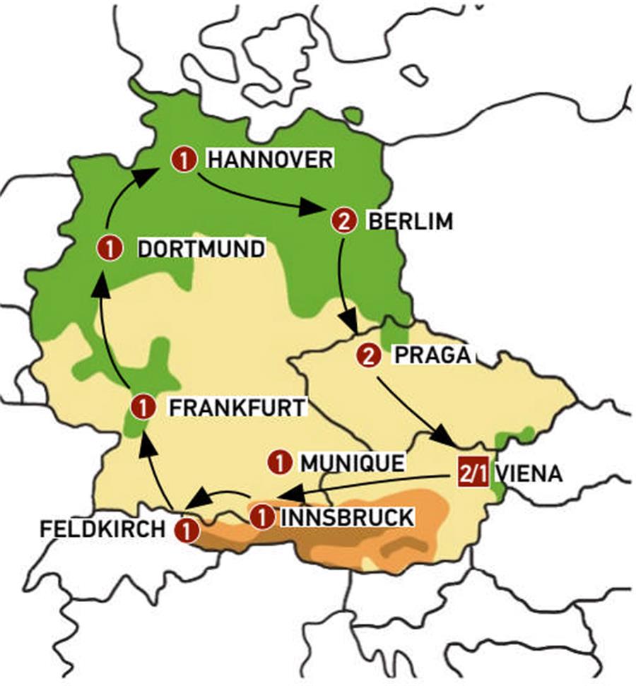 Viena, Salzburgo, Innsbruck, zugspitze, Feldkirch, Lago Constança , Lindau, Munique, Füssen, Rotemburgo, Frankfurt, crucero por el rhin, Colônia, Dortmund, ruta cuentos de hadas, Hannover, Goslar, Berlim, Dresden, Praga, Ceske Budejovice, Cesky Krumlov.