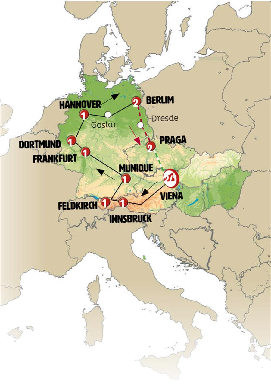 Viena, Salzburgo, Innsbruck, zugspitze, Feldkirch, Lago Constança , Lindau, Munique, Füssen, Rotemburgo, Frankfurt, crucero por el rhin, Colônia, Dortmund, ruta cuentos de hadas, Hannover, Goslar, Berlim.