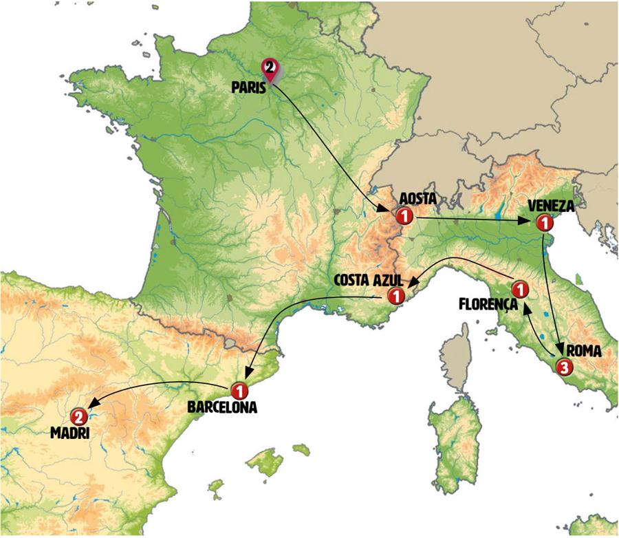 Paris, Genebra, Aosta, Veneza, Ravena, Assis, Roma, Florença, Pisa, SESTRI LEVANTE, Montecarlo, Cote D´azur, Arles, Barcelona, Madrid.