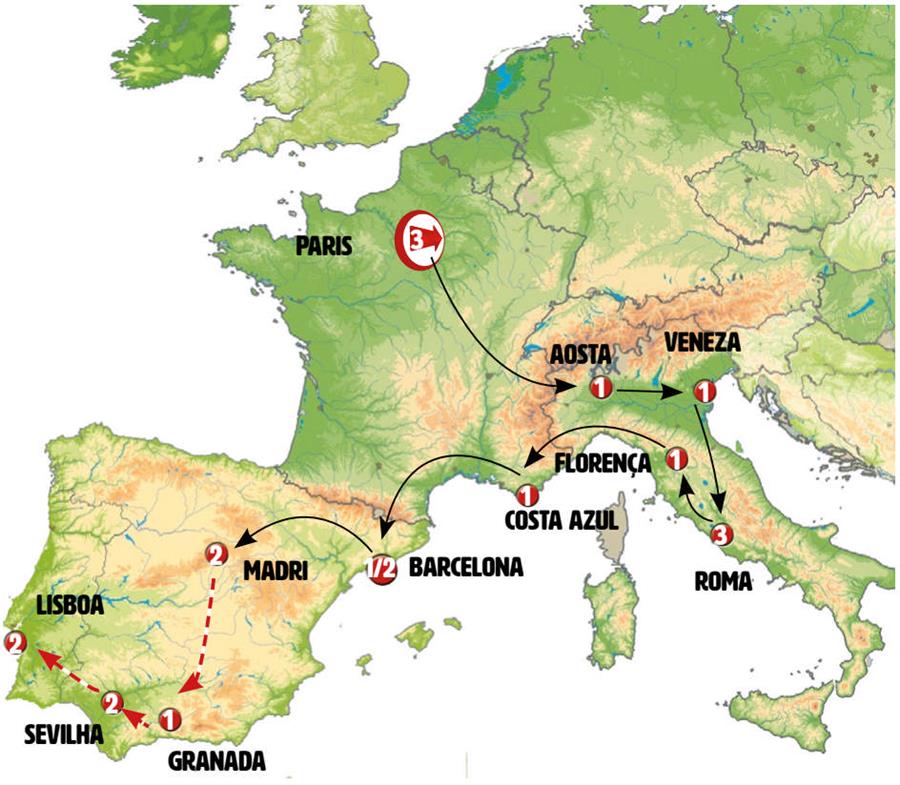 Paris, Genebra, Aosta, Veneza, Ravena, Assis, Roma, Florença, Pisa, SESTRI LEVANTE, Montecarlo, Cote D´azur, Arles, Barcelona, Madrid.