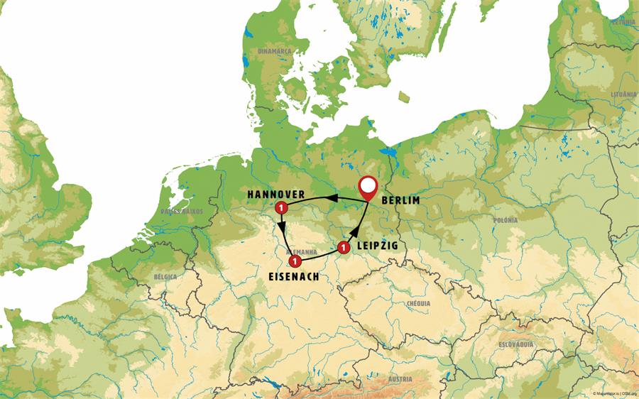 Berlim, wolfsburgo, Celle, Hannover, Goslar, gotinga, bad sooden, Eisenach, Gotha, Erfurt, Leipzig, Dresden, Meissen, moritzburg.