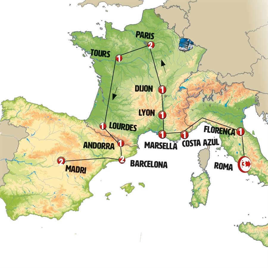 Roma, Florença, Pisa, SESTRI LEVANTE, Montecarlo, Cote D´azur, santa maxima, Saint Tropez, Marselha, Arles, Avignon, Lyon, Tournus, castillo de savigny, Beaune, Dijon, abadia de fontenay, semur en auxois, vezelay, Paris, Tours, Bordeaux, Lourdes, Carcassonne, Foix, Andorra, Montserrat, Barcelona, peniscola, Valência, Madrid.