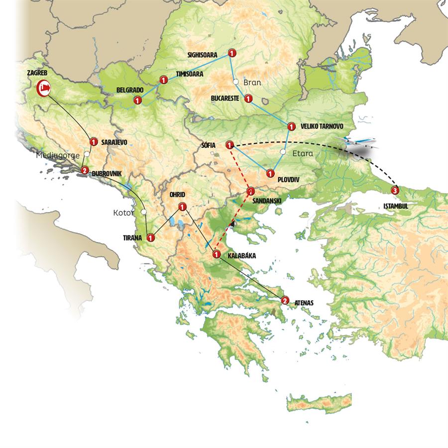 Zagreb, Banja Luka, jajce, Sarajevo, Mostar, Dubrovnik, Kotor, Budva, Tirana, struga, Ohrid, Bitola, Kalambaka, Delfos, Atenas.