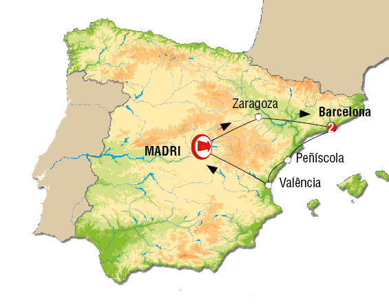 Madrid, Zaragoza, Poblet, Barcelona, peniscola, Valência.