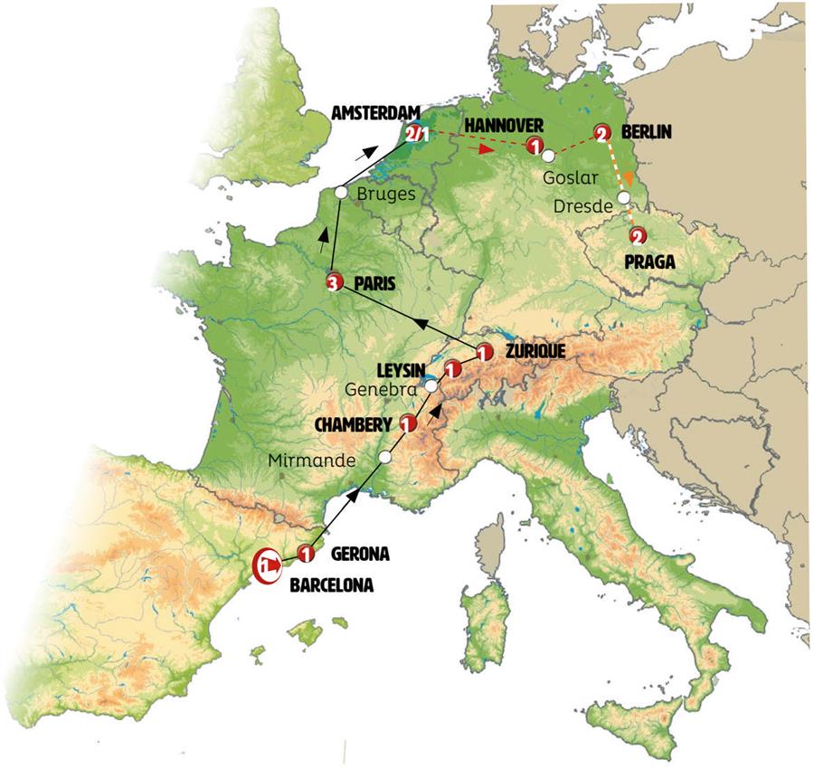 Barcelona, Gerona, carrieres de lumiere, Chambery, Genebra, Gruyeres, Leysin, Interlaken, Lucerna, Zurich, Strasbourg, Paris, Bruges, Amsterdã.