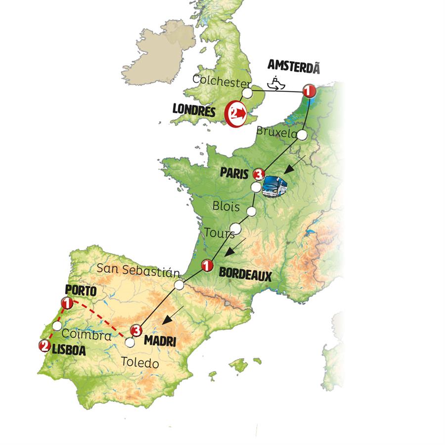 Londres, colchester, ferri colchester volendam, Volendam, Amsterdã, Bruxelas, Paris, Blois, Tours, Bordeaux, San Sebastian, Area de Serviço Foronda, Madrid, Cidade Rodrigo, Porto, Coimbra, Batalha, Nazaré, Óbidos, Lisboa.