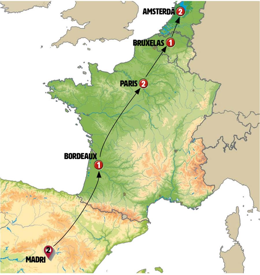 Madrid, San Sebastian, Bordeaux, Blois, Paris, Eperlecques, Calais, Bruges, Gante, Haia, Amsterdã.