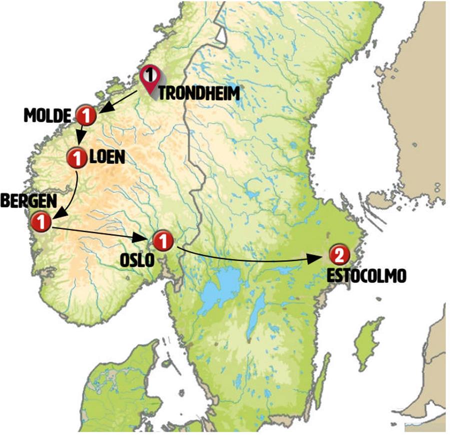 Trondheim, KRISTIANSUND, carretera atlantica, MOLDE, Geiranger, briksdal, Loen, Bergen, Eidfjord, voringfossen, Geilo, Oslo, Orebro, Estocolmo.