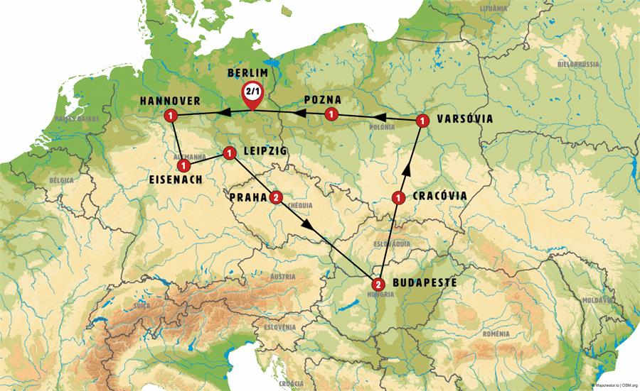 Berlim, wolfsburgo, Celle, Hannover, Goslar, gotinga, bad sooden, Eisenach, Gotha, Erfurt, Leipzig, Dresden, Praga, Lednice, Budapeste, Bratislava, Trencin, Cracóvia, Auschwitz, Czestochowa, Varsóvia, Poznan.