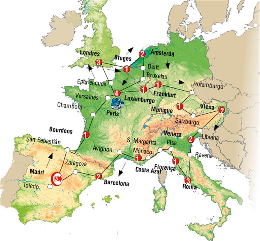 Madrid, San Sebastian, Bordeaux, Chambord, Paris, Canterbury, Londres, canal de la mancha, Bruges, Gante, Middelburg, Roterdã, Amsterdã, kinderdijk, Bruxelas, Bouillon, Luxemburgo, Cochem, crucero por el rhin, Frankfurt, Rotemburgo, Munique, Salzburgo, St. Wolfgang, Lago Traunsee, Viena, Bratislava, region de carintia , Veneza, Ravena, Assis, Roma, Florença, Pisa, SESTRI LEVANTE, Montecarlo, Cote D´azur, Arles, Barcelona, comarca del penedes, Zaragoza.