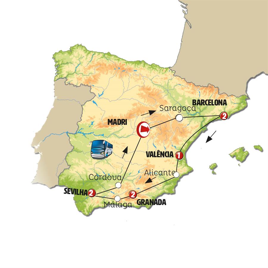 Madrid, Zaragoza, Poblet, Barcelona, peniscola, Valência, Alicante, Guadix, Granada, Nerja, Málaga, Ronda, Sevilha, Córdoba, consuegra.