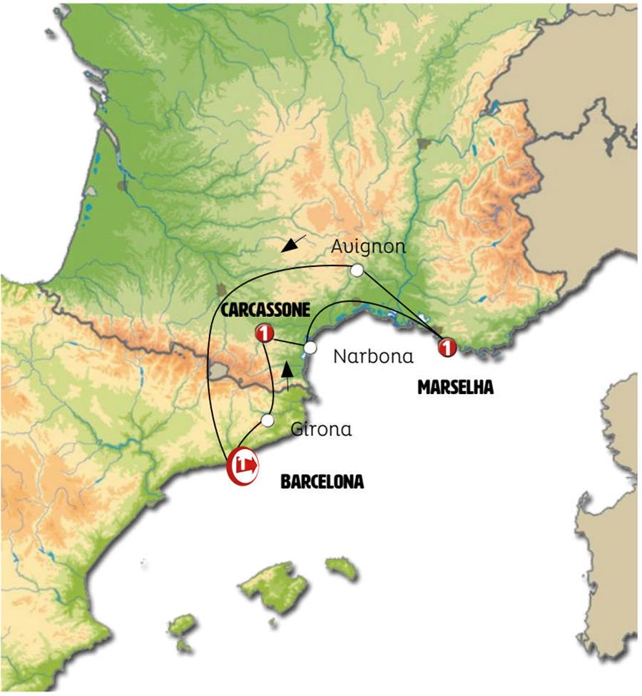Bem-vindo ao seu circuito Europamundo!Viajamos para o norte da Catalunha. GERONA, tempo nesta cidade com um magnífico centro histórico onde destacam edifícios medievais e reminiscências romanas, árabes e hebraicas. Sugerimos visitar a Catedral de Santa Maria, um impressionante edifício gótico na parte alta da cidade, e o antigo bairro judeu com suas ruas estreitas e pitorescas. Continuamos até a pequena cidade medieval de BESALÚ e tempo para almoçar e passear por suas vielas, sua impressionante ponte de pedra fortificada, seu castelo, os banhos judaicos e o antigo hospital dos peregrinos. Após o almoço, seguimos para a Catalunha francesa. COLLIOURE é uma pequena cidade costeira cheia de charme, sua praia, seu porto, suas vielas e seu impressionante castelo construído sobre um antigo castro romano que abrigava a corte dos reis de Maiorca. Se desejar, você pode ver o túmulo do poeta Antonio Machado. No final da tarde chegamos a CARCASSONNE, considerada a melhor cidade murada da Europa. Sugerimos ir ver as paredes iluminadas à noite e jantar em um de seus muitos pequenos restaurantes em "la cité".