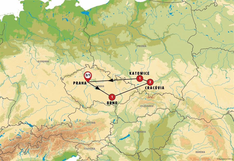 Praga, rBrno, Bratislava, Trencin, Cracóvia, Kalwaria Zebrzydowska, barwald dolny, Wadowice, Auschwitz, Katowice, Opole, Wroclaw.