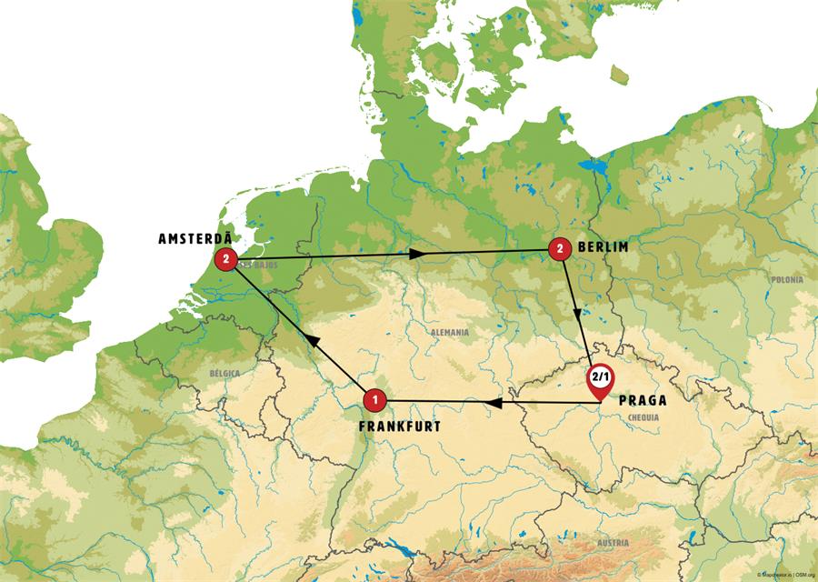 Praga, Pilsen, Rotemburgo, Frankfurt, crucero por el rhin, Colônia, Amsterdã, Hamelin, Berlim, Dresden.