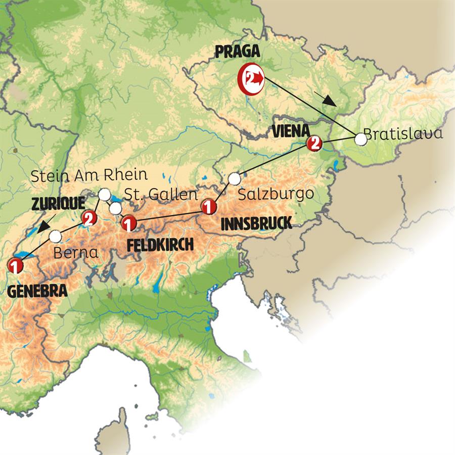 Praga, rBrno, Bratislava, Viena, Salzburgo, Innsbruck, zugspitze, Feldkirch, saint gallen, Constança, Stein Am Rhein S, cataratas del rin, Zurich, Berna, Montreux, Genebra.