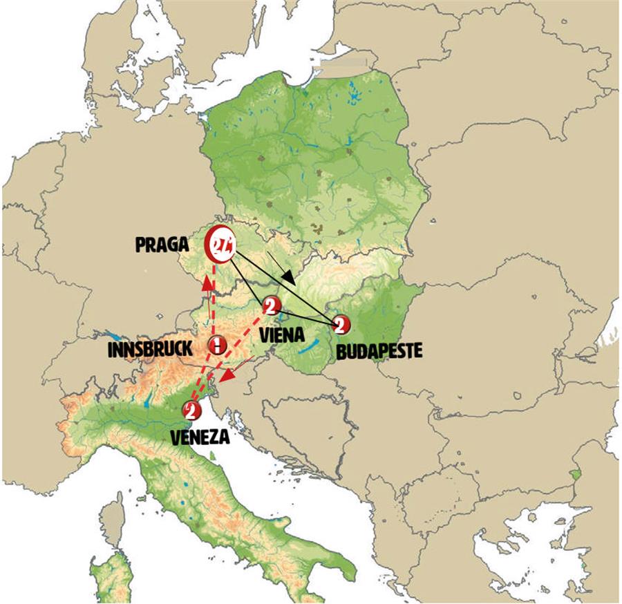 Praga, Ceske Budejovice, Cesky Krumlov, Viena, Maribor, Liubliana, Veneza, Verona, Lago de Garda, Innsbruck, Munique, Ratisbona.