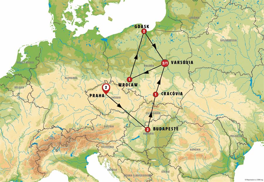 Praga, Lednice, Budapeste, Bratislava, Trencin, Cracóvia, Auschwitz, Czestochowa, Varsóvia, Wroclaw, Poznan, Torun, Gdansk, malbork, frombork, elblag.