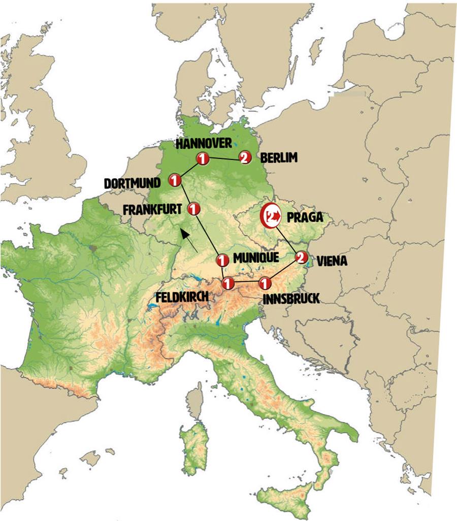 Praga, rBrno, Bratislava, Viena, Salzburgo, Innsbruck, zugspitze, Feldkirch, Lago Constança , Lindau, Munique, Füssen, Rotemburgo, Frankfurt, crucero por el rhin, Colônia, Dortmund, ruta cuentos de hadas, Hannover, Goslar, Berlim.