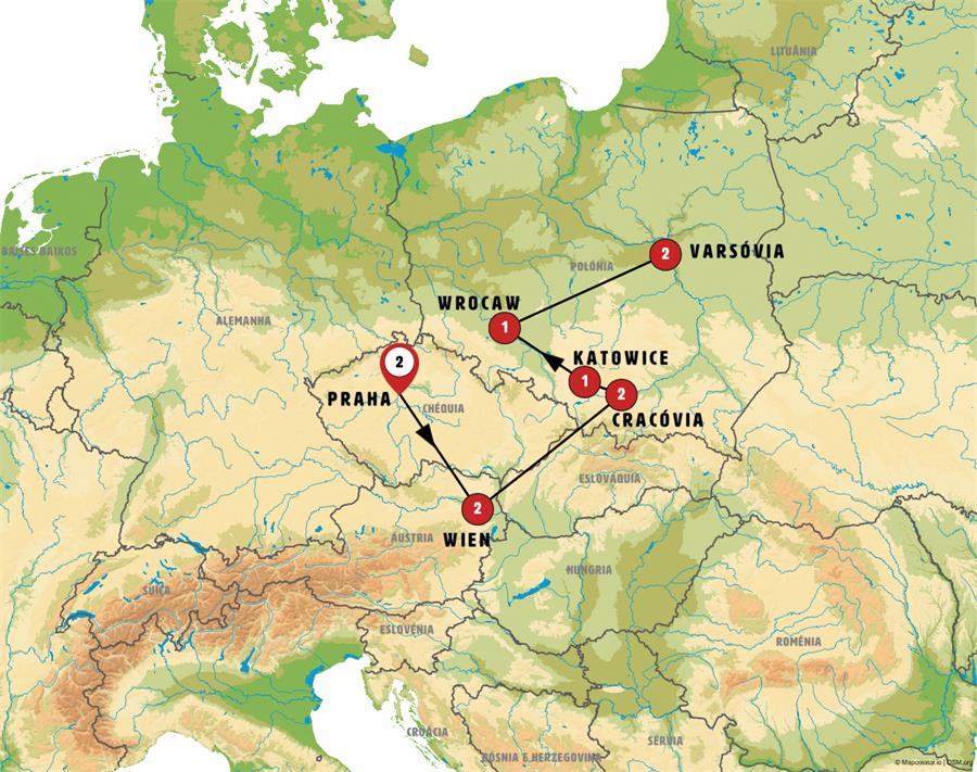 Praga, Ceske Budejovice, Cesky Krumlov, Viena, Bratislava, Trencin, Cracóvia, Kalwaria Zebrzydowska, barwald dolny, Wadowice, Auschwitz, Katowice, Opole, Wroclaw, Poznan, Torun, Varsóvia.