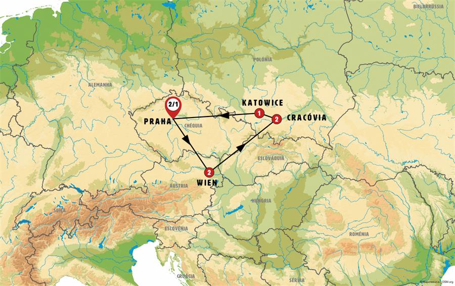 Praga, Ceske Budejovice, Cesky Krumlov, Viena, Bratislava, Trencin, Cracóvia, Kalwaria Zebrzydowska, barwald dolny, Wadowice, Auschwitz, Katowice, Opole, Wroclaw.