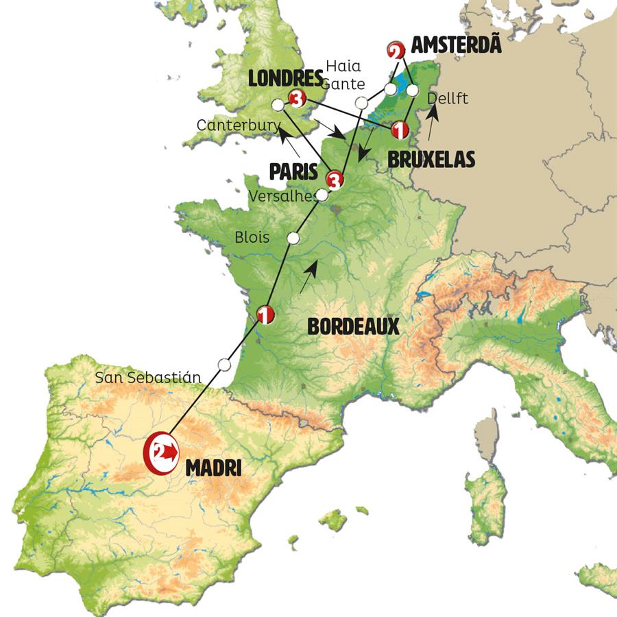 Madrid, San Sebastian, Bordeaux, Blois, Paris, Canterbury, Londres, Calais, Bruges, Gante, Haia, Amsterdã, Delft, Bruxelas.