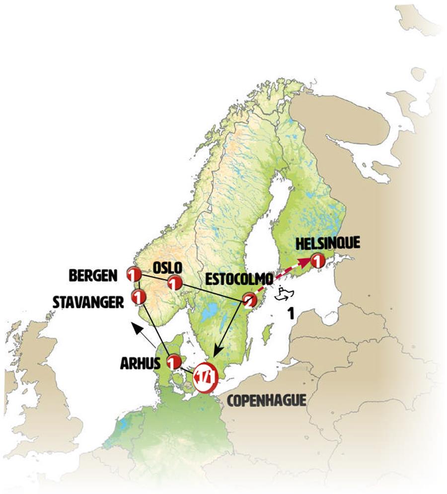 Copenhague, Odense, Arhus, ferri kristiansand, Kristiansand, Stavanger, Bergen, fiordo sogne, Oslo, Orebro, Estocolmo, Helsingor.