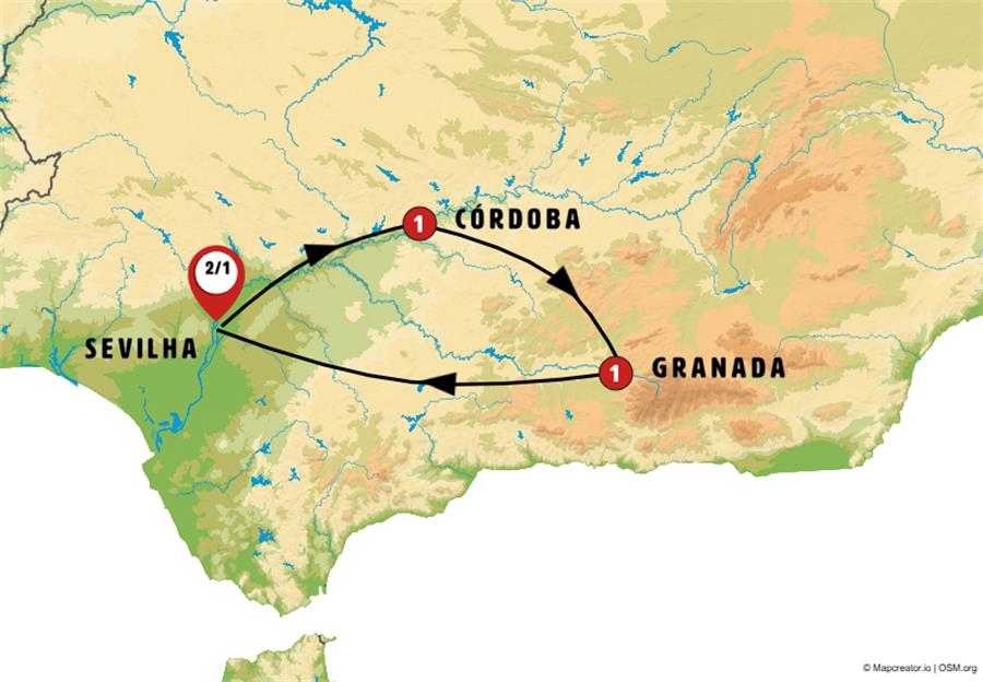 Sevilha, Carmona, Córdoba, baena, Granada, Nerja, Málaga, Ronda.
