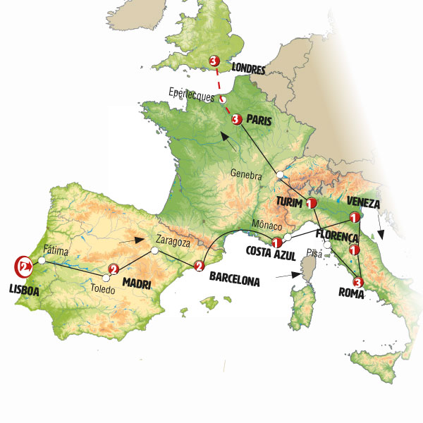 Madrid, Zaragoza, Barcelona, Cote D´azur, Cidade de Mônaco, Gênova, Veneza, Florença, Roma, Pisa, Torino , Genebra, Paris, Bruges, Amsterdã, kinderdijk, Bruxelas, Blois, Tours, Bordeaux, San Sebastian, Area de Serviço Foronda.