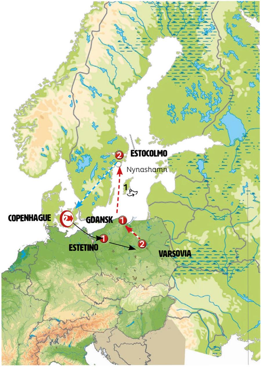Copenhague, Rostock, Szczecin, Bydgoszcz, Torun, Varsóvia.