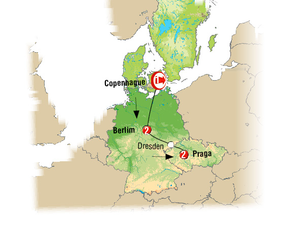 De manhã, incluímos um passeio panorâmico com um guia local da capital dinamarquesa, uma cidade conhecida por sua qualidade de vida, respeito à sustentabilidade e rica vida cultural. Vamos conhecer "A Pequena Sereia", o porto de Nyhavn com seus coloridos edifícios históricos, o exterior do Palácio de Amalienborg, onde a família real dinamarquesa reside, a praça da prefeitura e a área do parque Tívoli. A continuação saímos ao sul da Dinamarca. Em GEDSER tomamos o ferry, travessia de umas duas horas rumo a Alemanha. Chegada a Warnemunde continuação até BERLIM, chegada no final do dia.Nota: se o número de passageiros que fazem a viagem entre Copenhague/Berlim for muito limitado, este trecho poderá ser realizado numa linha regular de passageiros sem alterar o conteúdo da etapa.