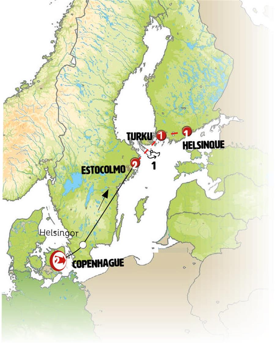 A viagem continua até HELSINGOR, a cidade de Hamlet, na qual se destaca seu grande Castelo de Kronborg. em seguida a viagem prossegue para a SUÉCIA com uma curta travessia em ferry (viagem curta de 20 minutos, na qual se recomenda realizar câmbio monetário para obter Coroas Suecas). A viagem prossegue entre paisagens de lagos grandes e densas florestas. Em JONKOPING, tempo para passear e almoçar nesta pequena cidade moderna com seu grande lago. A viagem segue até VADSTENA, uma pitoresca vila à beira do lago com suas casas antigas e seu grande castelo do século XIV que foi convertido em um mosteiro. Continuação à ESTOCOLMO. Chegada no final do dia.