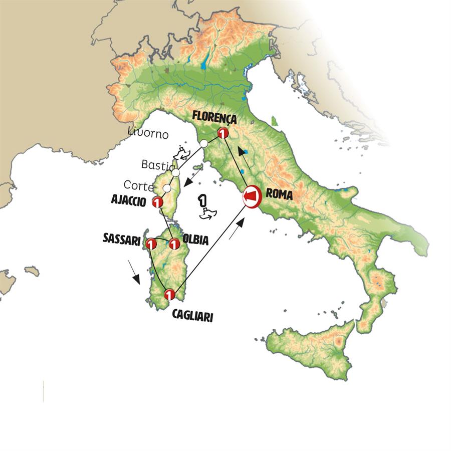 Roma, Florença, Livorno, Bastia, Corte, Ajaccio, Bonifacio, Palau, La Maddalena, Sassari, ALGHERO, Bosa, Cagliari, nuraghe losa, Olbia, ferri cagliari civitavecchia.