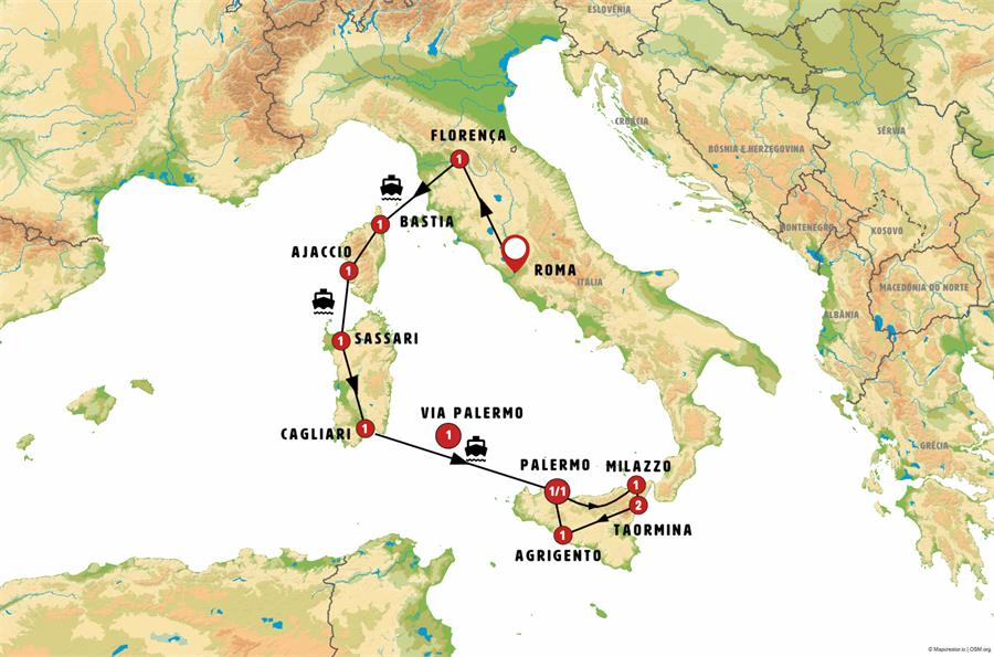 Roma, Florença, Livorno, Bastia, Corte, Ajaccio, Bonifacio, Palau, La Maddalena, Sassari, ALGHERO, Bosa, Cagliari, ferri cagliari palermo, Palermo, Cefalu, Castelbuono, tindaris, Milazzo, Vulcano, Lipari, Taormina, Catania, Siracusa, Agrigento, Marsala, Érice.