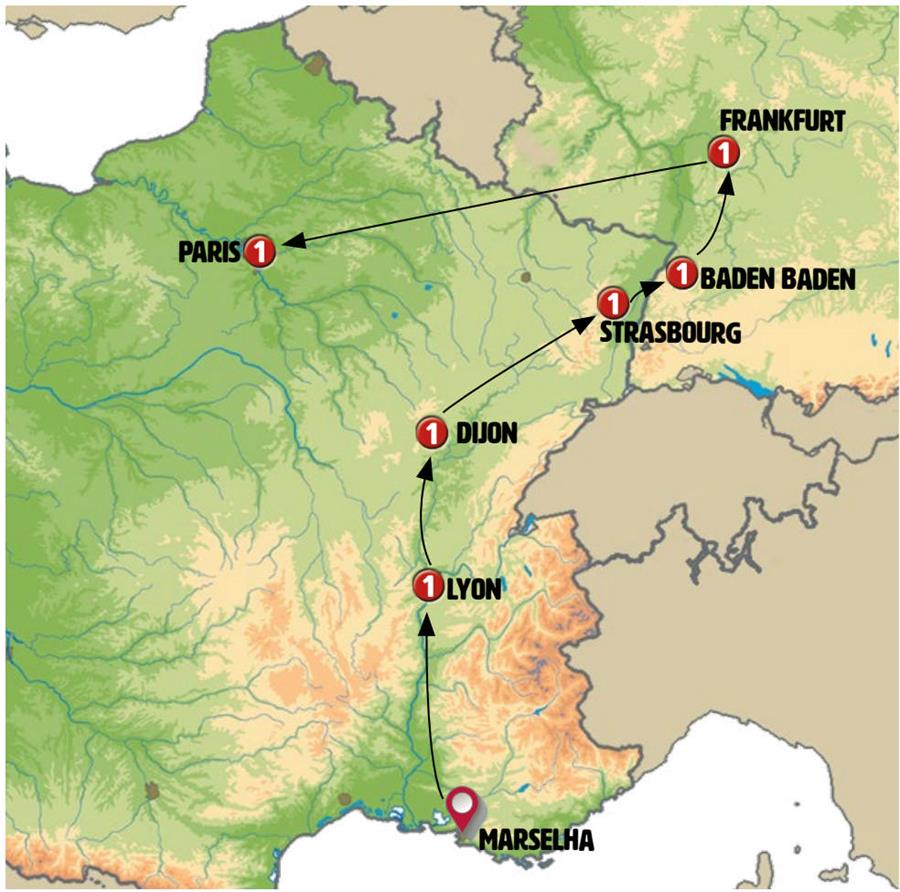 Marselha, Arles, Avignon, Lyon, Tournus, castillo de savigny, Beaune, Dijon, besanzon, Colmar, Riquewihr, Strasbourg, friburgo de brisgovia, Triberg, Gengenbach, baden baden, espira, Heidelberg, Frankfurt, Luxemburgo, Reims, Paris.
