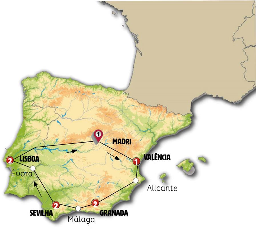 Madrid, Alarcon, Valência, Alicante, Guadix, Granada, Nerja, Málaga, Ronda, Sevilha, Merida, Évora, Lisboa, Cáceres.