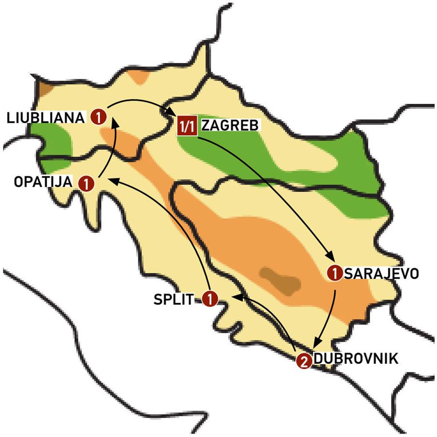 Zagreb, Banja Luka, jajce, Sarajevo, Mostar, Dubrovnik, Ston, Split, Plitvice, Opatija, postjona, Bled, Liubliana, Maribor.