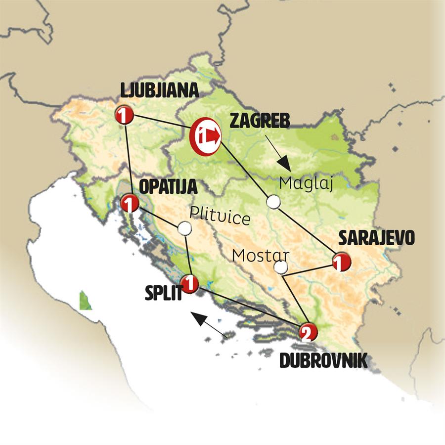Zagreb, Banja Luka, jajce, Sarajevo, Mostar, Dubrovnik, Ston, Split, Plitvice, Opatija, postjona, Bled, Liubliana, Maribor.