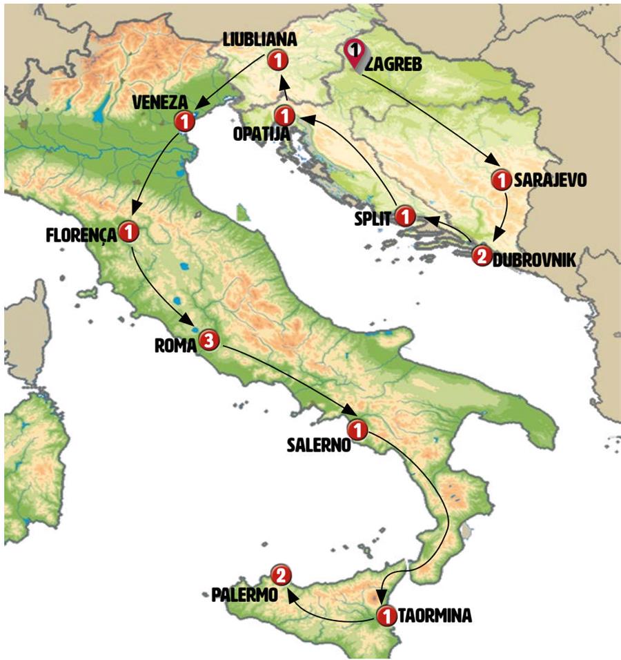 Zagreb, Banja Luka, jajce, Sarajevo, Mostar, Dubrovnik, Ston, Split, Plitvice, Opatija, postjona, Bled, Liubliana, Veneza, Florença, Roma, Nápoles, Capri, Sorrento, Salerno, Paola, mesina , Taormina, Giardini Naxos , villa romana del casale, Palermo.