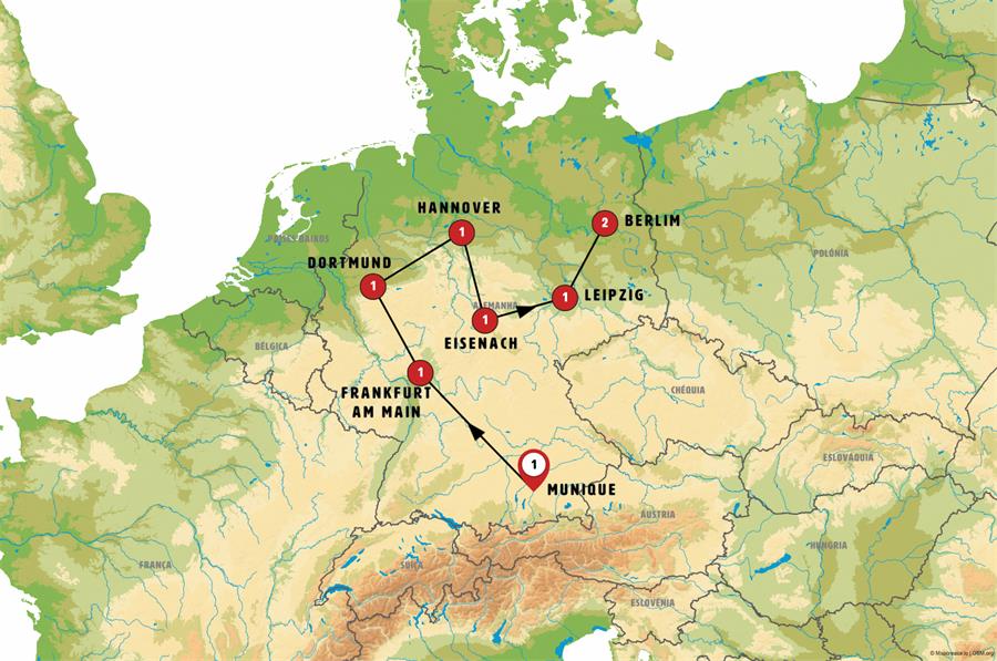 Munique, Füssen, Rotemburgo, Frankfurt, crucero por el rhin, Colônia, Dortmund, ruta cuentos de hadas, Hannover, Goslar, gotinga, bad sooden, Eisenach, Gotha, Erfurt, Leipzig, Dresden, Meissen, moritzburg, Berlim.