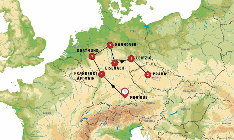 Munique, Füssen, Rotemburgo, Frankfurt, crucero por el rhin, Colônia, Dortmund, ruta cuentos de hadas, Hannover, Goslar, gotinga, bad sooden, Eisenach, Gotha, Erfurt, Leipzig, Dresden, Praga.