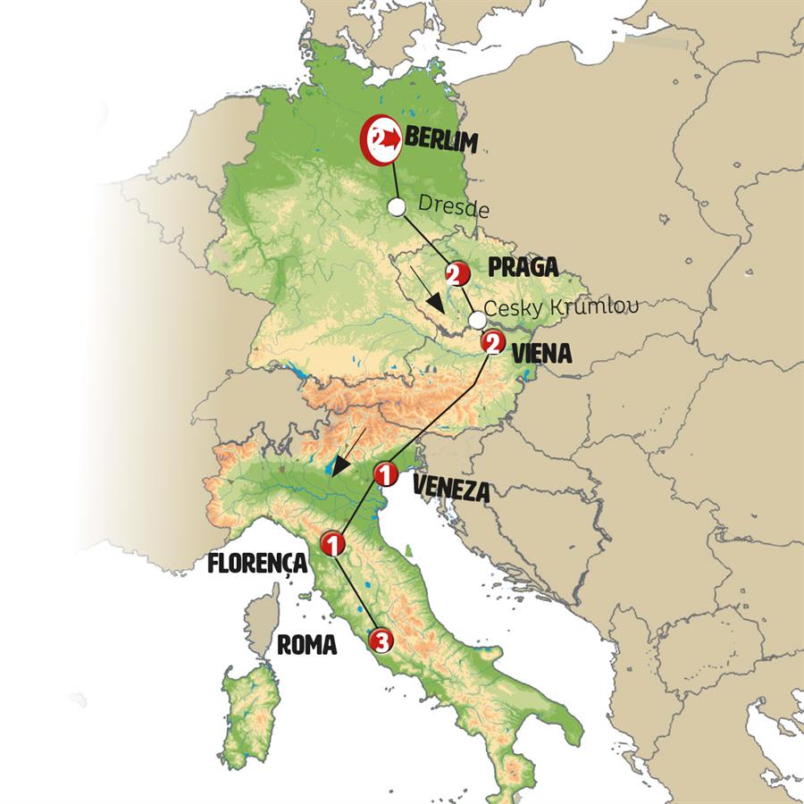 Berlim, Dresden, Praga, Ceske Budejovice, Cesky Krumlov, Viena, Maribor, Liubliana, Veneza, Florença, Roma.