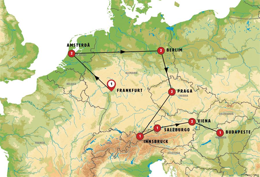 Frankfurt, crucero por el rhin, Colônia, Amsterdã, Hamelin, Berlim, Dresden, Praga, Munique, Innsbruck, Salzburgo, Lago Traunsee, Viena, Budapeste.